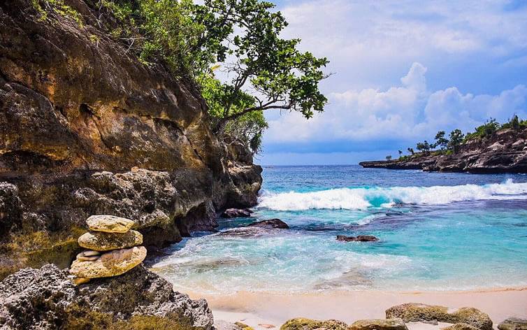 Pandan Beach in Nusa Penida is a secluded and peaceful stretch of white sand tucked between lush cliffs near Crystal Bay. Accessible by a short trek, this hidden beach offers calm waves, clear blue water, and a quiet atmosphere perfect for relaxation. Its untouched beauty and panoramic views make Pandan Beach a favorite spot for those seeking a more private and natural escape.